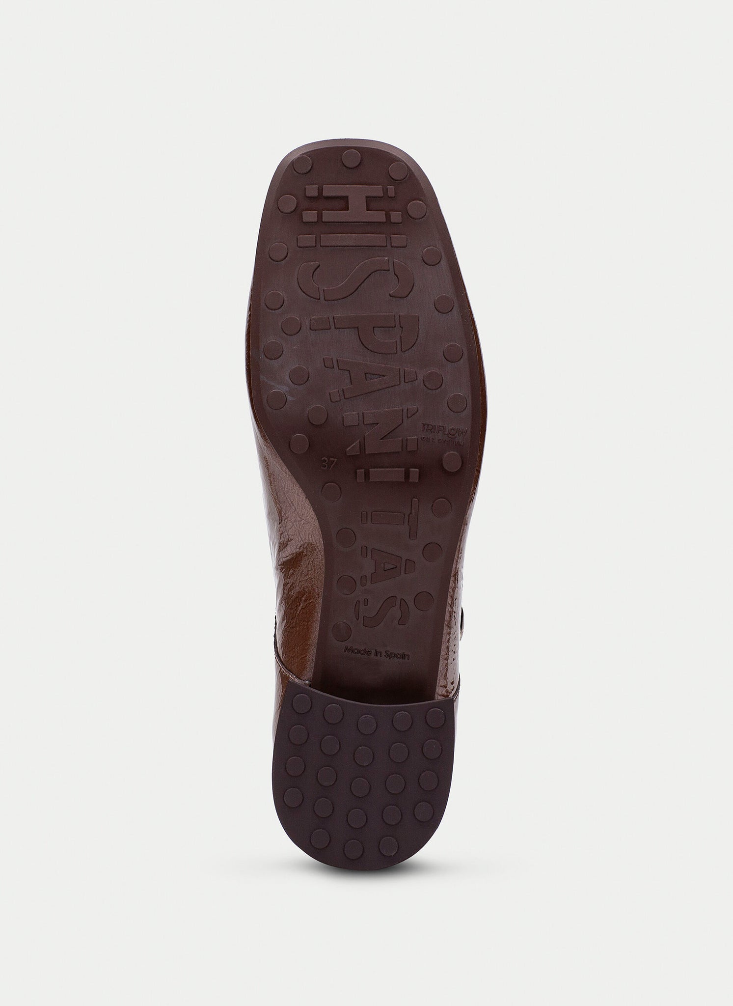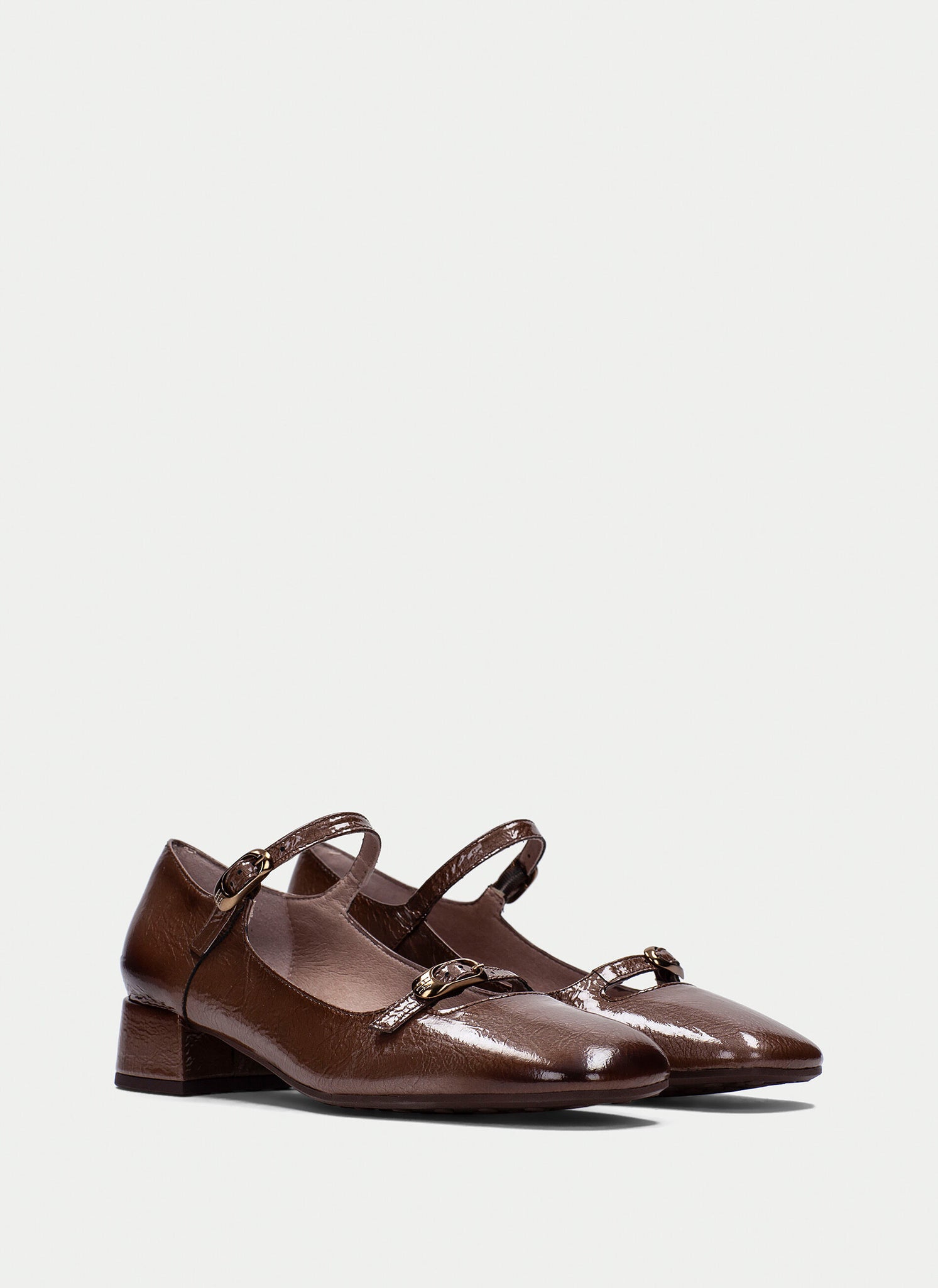 Square-toe Mary Jane with adjustable buckle straps on the instep.