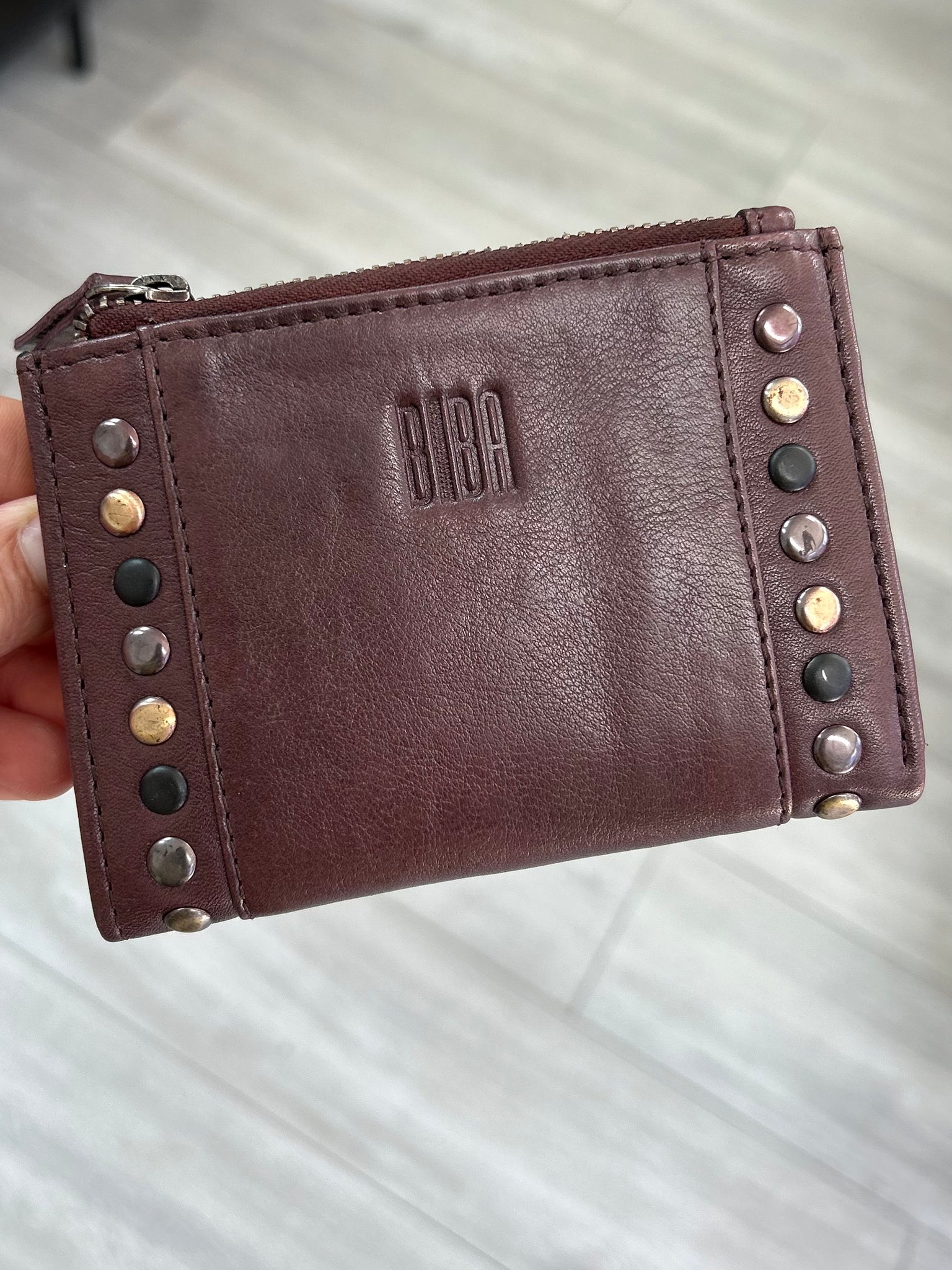 Small washed cowhide wallet. Front and rear decorative studs. Button closure. Compartments for bills, cards and coins. RFID security system.