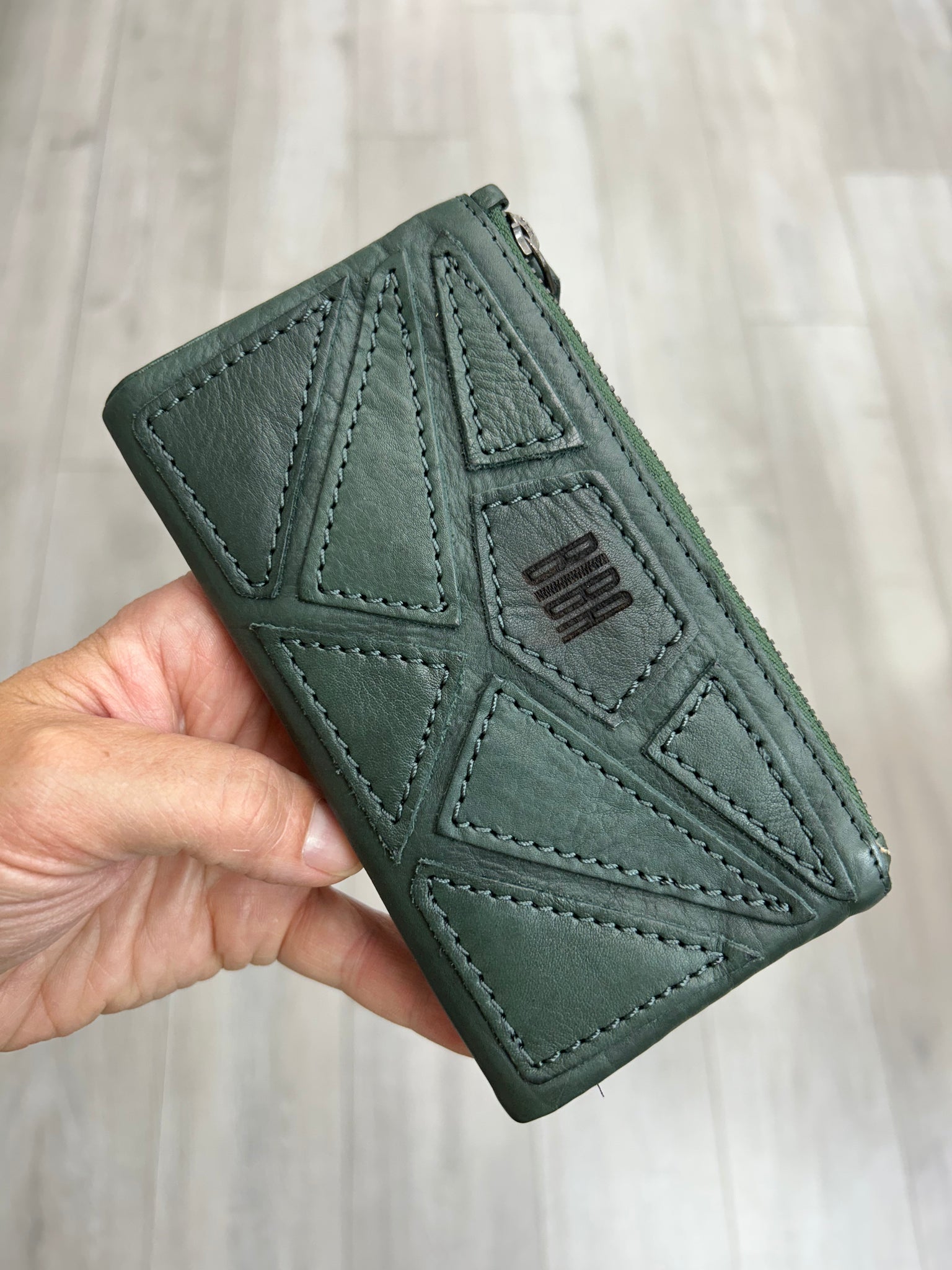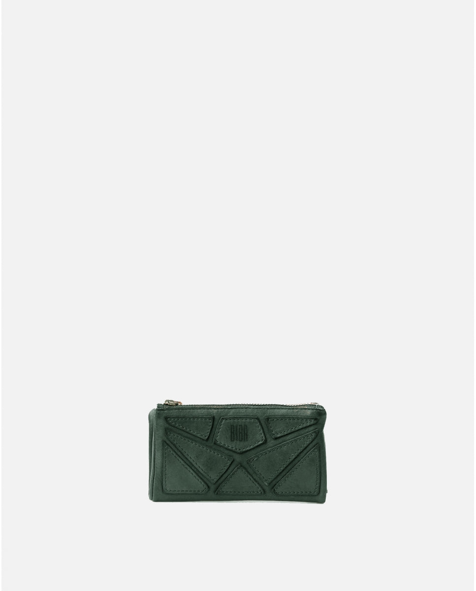 Medium washed and braided cowhide wallet. Frontal decorative leather patchwork. Button closure. Compartments for banknotes, cards and coins. RFID security system.