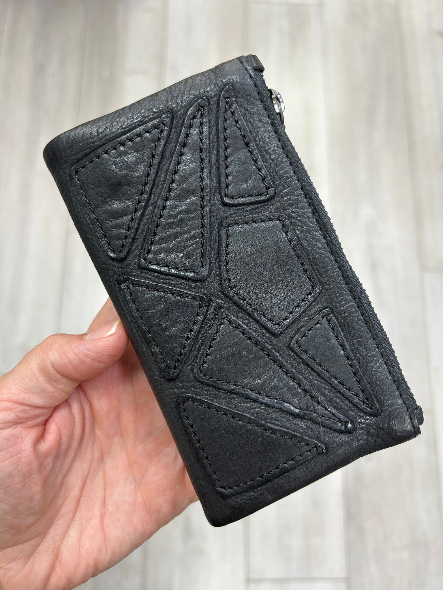 Medium washed and braided cowhide wallet. Frontal decorative leather patchwork. Button closure. Compartments for banknotes, cards and coins. RFID security system.
