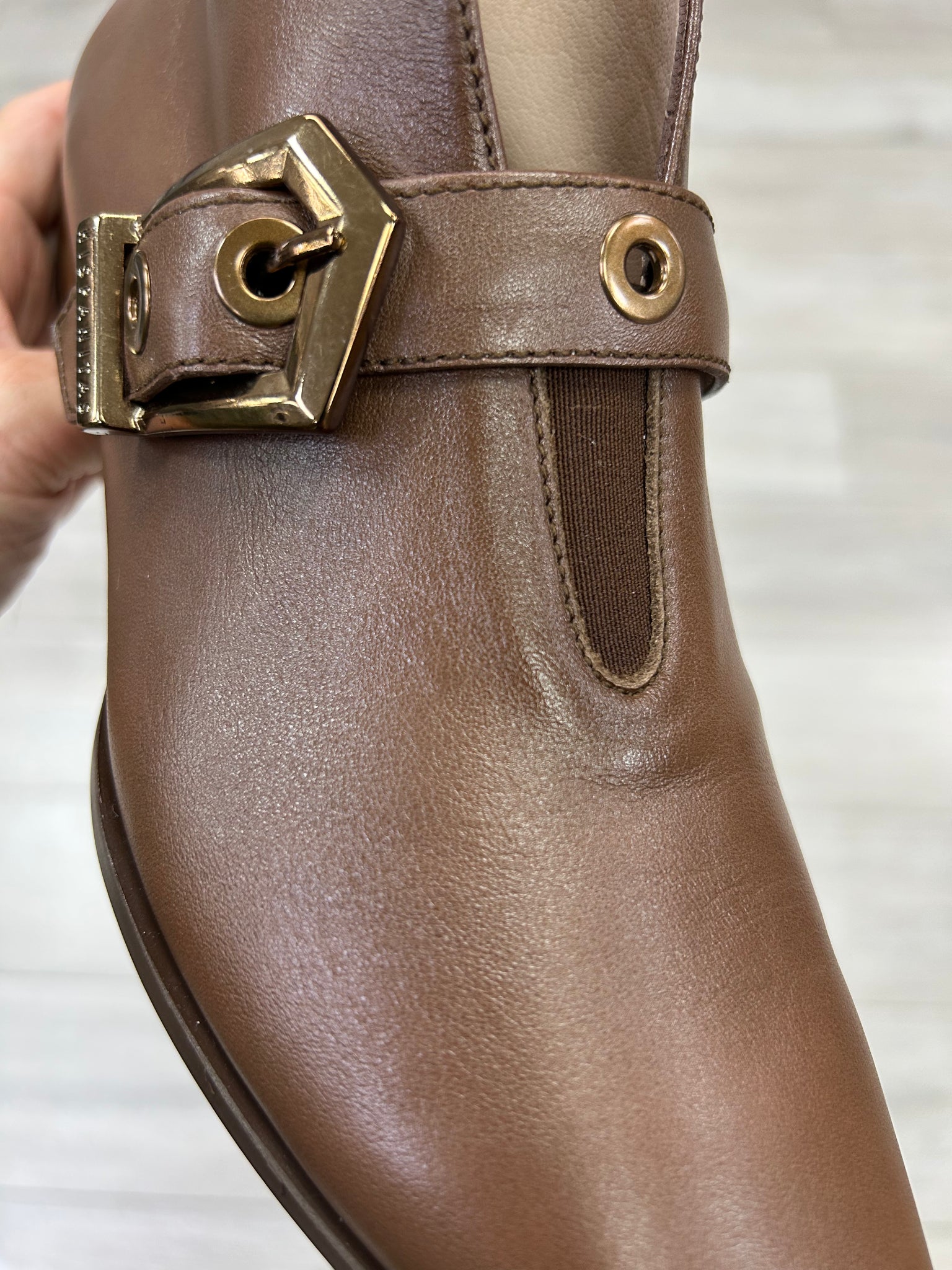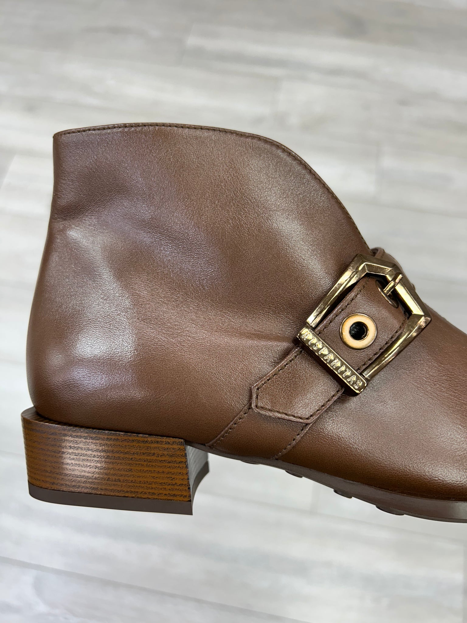 Casual pointed-toe ankle boot with a maxi buckle detail and eyelets on the instep.