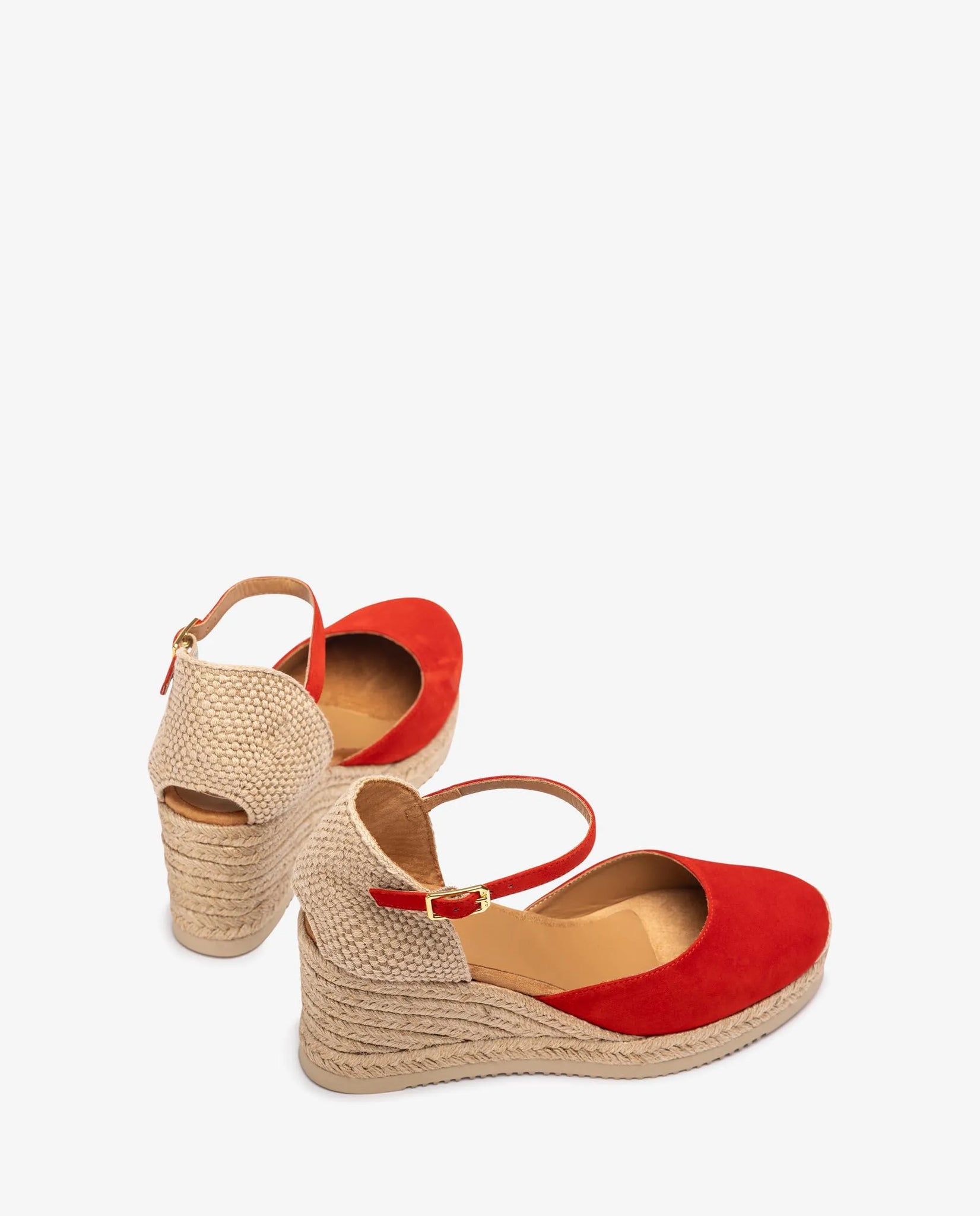 CACERES_26_KS Round toe espadrille made in suede. Raffia heel counter and an ankle strap that can be adjusted with the metal buckle. 1cm platform and a 5cm wedge covered in jute. Lighter and more flexible EVA sole than ever before thanks to the Unisa Superlight technology. Our CACERES model has become a real Unisa classic.