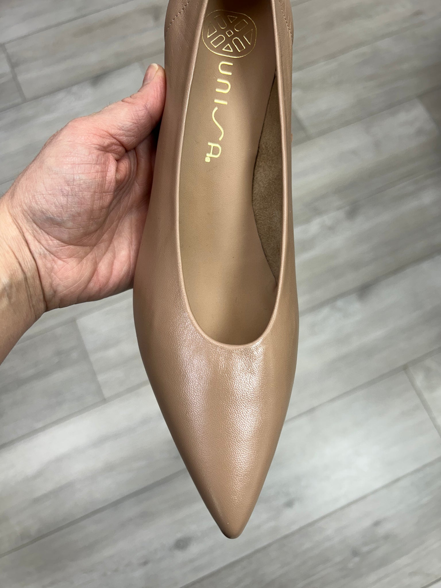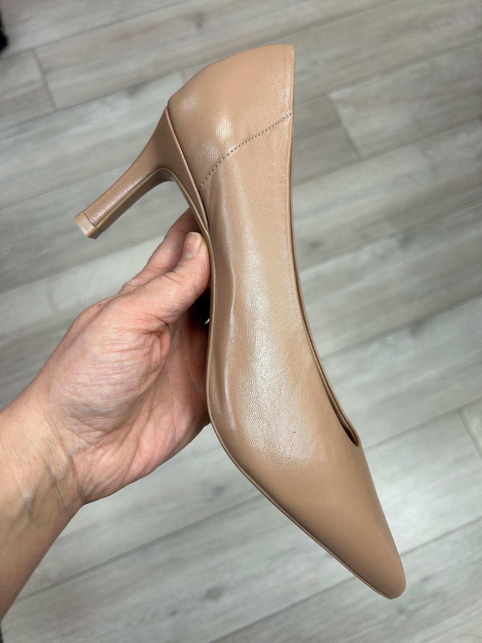Pointed toe pump made in leather. High throat and a thin heel that is 7cm high in a matching tone. Light, flexible, non-slip rubber sole. A basic must-have in your wardrobe.