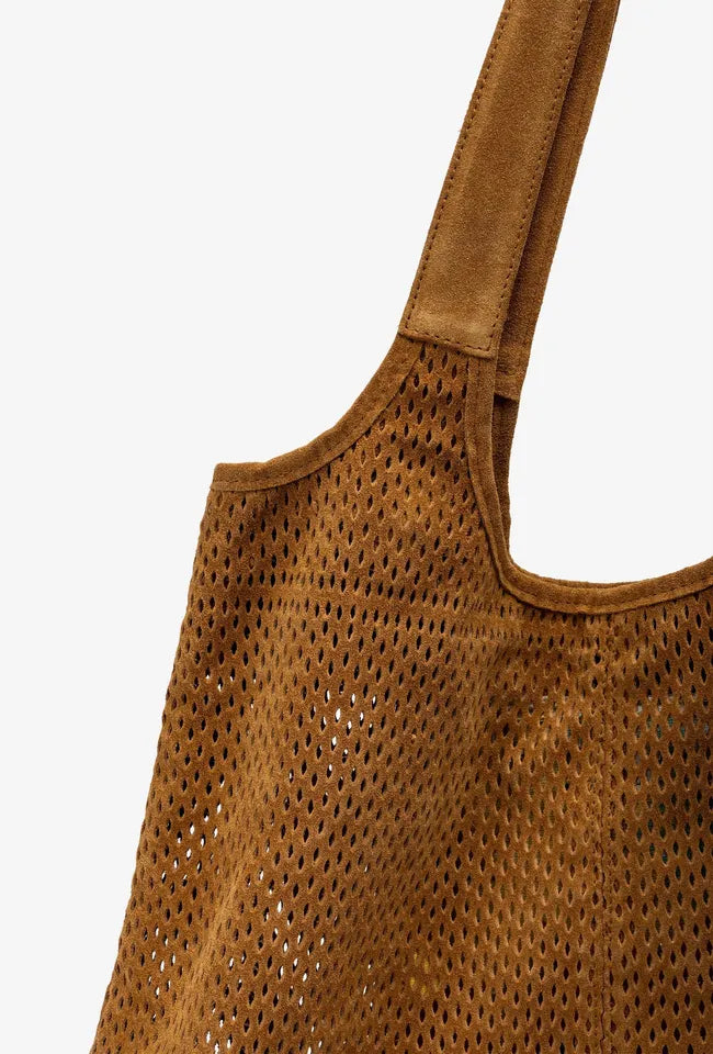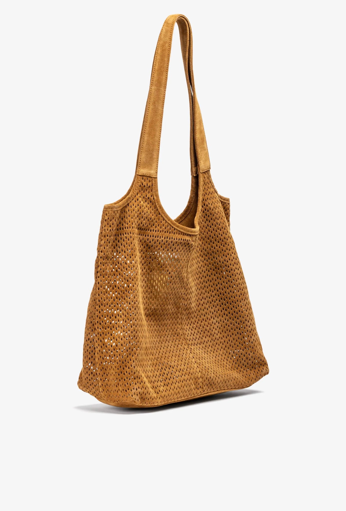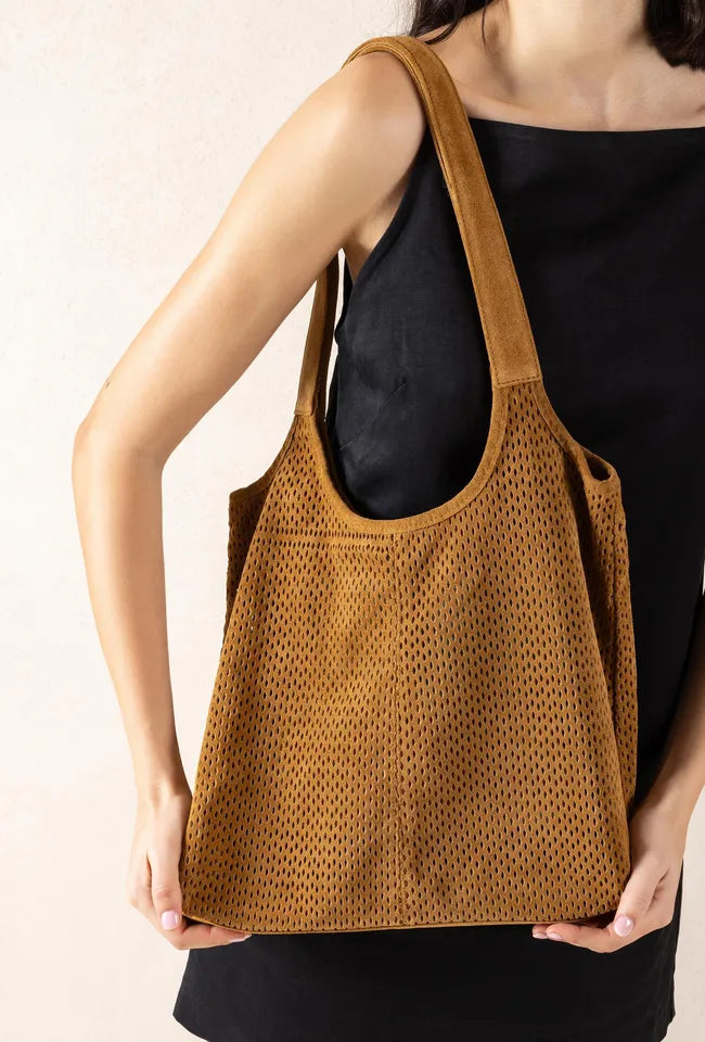 Medium size handbag made in suede with decorative punchings. Magnetic snap closure and a pocket inside with a zip. Available in various colours, which is your favourite? Size: 28cm x 29cm x 14cm