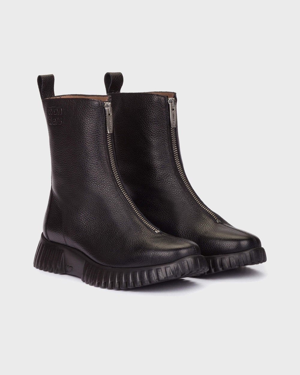 FLEXFLY 03 ankle boots crafted in black textured leather. This modern design features a central metallic zipper along the shaft, a rear pull tab, and a debossed logo on the outer side, ensuring an easy and secure fit. The sole, developed with WondersFly™ technology by XL EXTRALIGHT®, ensures exceptional lightness and extraordinary comfort. In addition, the removable MemoryGel insole adapts perfectly to the shape of your foot, offering comfort with every step. Get ready to feel the #YesWeFly sensation. Wonders is committed to responsible manufacturing certified by LEATHERWORKINGGROUP.