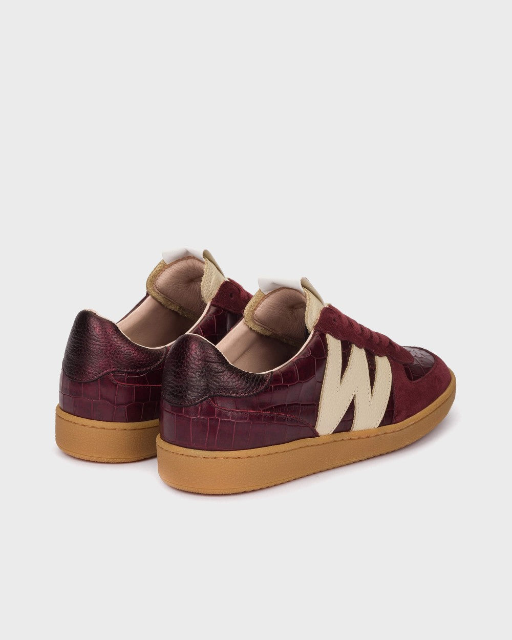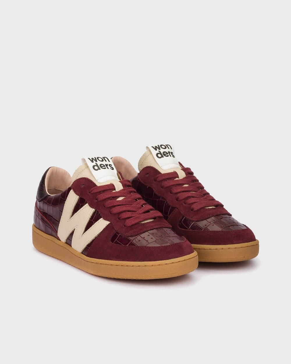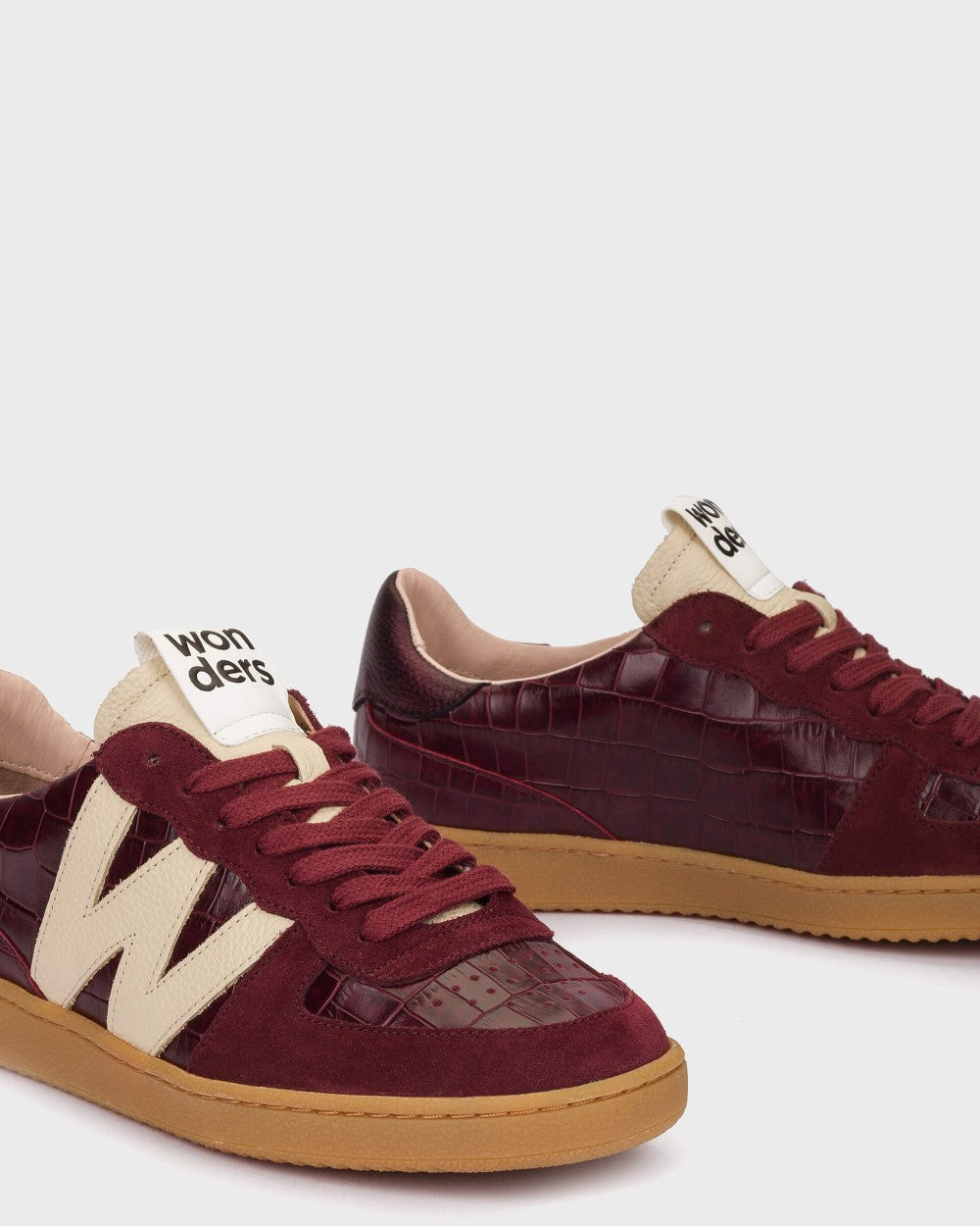 NUBIA 02 flat sneakers crafted from a mix of leather textures in different burgundy tones. This model features a retro, timeless design. The brown croc-embossed leather and the metallic heel piece add distinctive character. The fit is adjusted with traditional laces. The caramel sole provides great flexibility, while the MemoryGel insole ensures cushioned comfort with every step. #madewithloveinSpain Wonders supports responsible manufacturing via LEATHERWORKINGGROUP.
