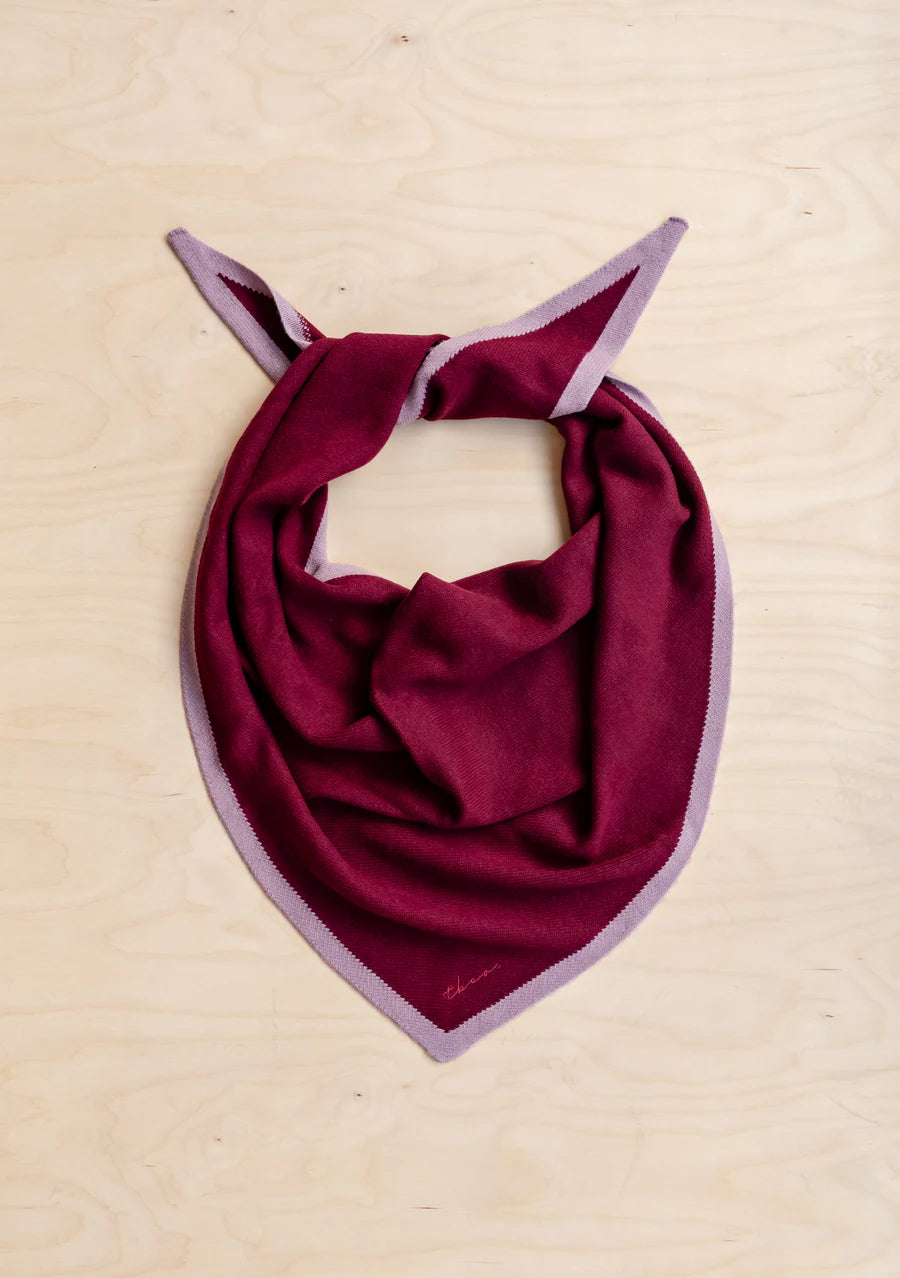 Elevate your outfit with this large burgundy triangle scarf knitted from super soft merino wool, featuring a lilac edge and an embroidered TBCo logo. It can be tied multiple ways for endless styling options and is the perfect finishing touch that you'll reach for time and time again.